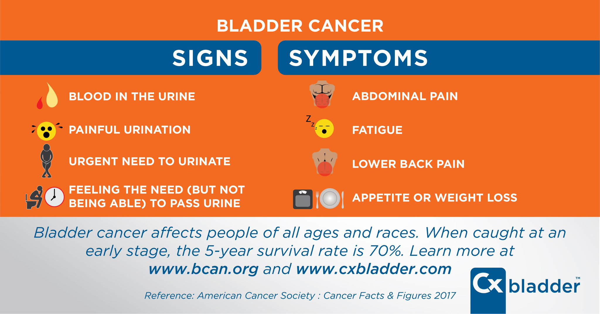 Bladder Cancer Symptoms Stages Treatment from images.onhealth.com Bladder cancer is usually treatable when caught at an early stage but more challenging to address when found later. 8 out of 10 people with bladder cancer (80%) have some blood in their urine. Bladder cancer can often be found early because it causes blood in the urine or other urinary symptoms that cause a person to see a health care provider. It's easy for women to overlook because it's typically painless and can go weeks or even months between occurrences. Since the early signs of bladder cancer are quite obvious, early detection can be easier than in other types of cancer. If there is enough blood it can change the color of the urine to be orange, pink, or darker red. People with bladder cancer may experience the following symptoms or signs. Sometimes, people with bladder cancer do not have any of these changes.